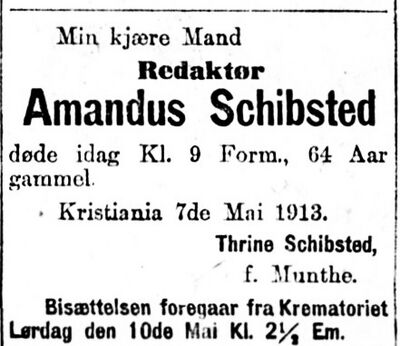 - Aftenposten 7. mai 1913, omtale av Amandus Schibsteds død.