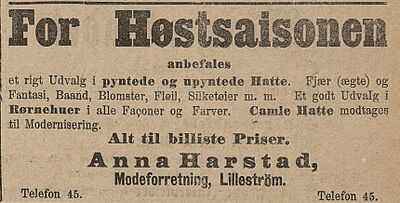 Anna Harstad. Modeforretning ble opprettet mellom 1915 og 1920 av søstrene Anna (f. 1878), Sofie (f. 1880) og Thora (f. 1890) Harstad i Storgata 3. i Lillestrøm. Et av salgsproduktene var hatter. Foreldrene var bruksfullmektig Peder Harstad (f. 1848) og Sofie (f. 1848).