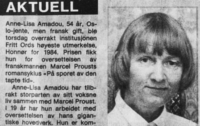 | Med oversettelsen fra fransk av Marcel Prousts romanserie "På sporet av den tapte tid" viser hun hvor rikt det norske språk kan være. Det man på forhånd trodde ville bli en tålmodighetsprøve, blir en frydefull leseropplevelse gjennom hele 12 bind - like mye på grunn av det overraskende smidige norske språket som det fargerike menneskelige universet som Proust bretter ut. ... Amadous evne til å skape et presist, enkelt og klangfullt norsk er enestående. Ofte finner hun tilbake til nesten glemte ord, men Anne-Lisa Amadou får ordene til å virke friske og levende. ... Som veileder var hun enestående. Bekymrede studenter ble trygge, og selvtilliten blomstret etter møter med henne. | ||