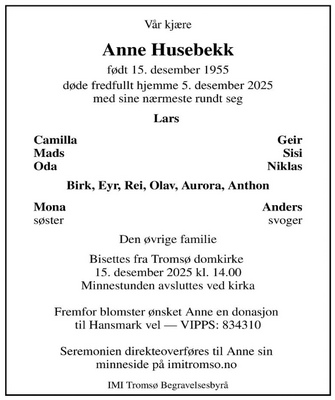 - ↑ Anne Husebekk er død. NRK.no, 06.12.2025. Besøkt 16.12.2025.
