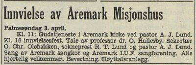 - «Aremark misjonshus innvies 3. april». Halden Arbeiderblad 1955.03.22. Digital versjon på Nettbiblioteket