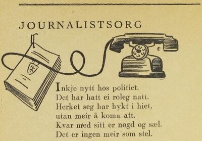 Faksimile fra Arne Dombens diktsamling No er eg blitt politi! fra 1943, første vers av diktet Journalistsorg, om en stille natt ved politivakten (med tegning av Arne Wold).