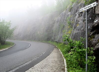 Motiv fra Arnulf Øverlands vei en tåkefull junidag i 2015.