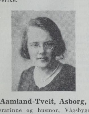 Asborg Aamland-Tveit, født 15. august 1903 i Åseral, død 10. februar 1981, var lærer og husmor. Hun tok eksamen ved Kristiansand lærerskole i 1925. Asborg Aamland-Tveit var en tid vikar i Søgne og Åseral og hun var leder av misjonsbarnelag og drev søndagsskole.