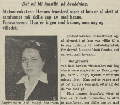 Retten tok ikke hensyn til formildende omstendigheter og de siste vitnemålene, og den 1. mars 1946 ble Aud Maggi Andersen dømt til døden. Dommen falt under dissens, med fem dommere som gikk inn for dødsstraff, mens de to siste ville idømme tvangsarbeid i tjue år. Hovedbegrunnelsen for dødsdommen var at flertallet mente at handlingene var opportunistisk motivert; hun hadde frivillig gått i tysk tjeneste mot betaling, og må ha vært klar over følgene angiveriet kunne få. Her har dommerne åpenbart et poeng; Andersen ser ut til å selv ha blitt skremt av Gestapo, men hun overlot andre i deres klør. Mindretallet trakk fram hennes vanskelige barne- og ungdomsår, og at hun hadde kommet under tysk innflytelse på grunn av uheldige omstendigheter. De så også svært alvorlig på angiveriet, men der flertallet tolka det som opportunisme, følte mindretallet at hun var under tvang. Det er ikke urimelig at hun frykta en ny arrestasjon dersom hun nekta å jobbe for tyskerne. Det forsvarer ikke hennes handlinger, for mange ble stilt ovenfor lignende og vanskeligere valg i krigsårene, men det kan bidra til å forklare og forstå dem som noe annet enn ondskap eller opportunisme. Begge forklaringer er rimelige tolkninger, og har det til felles at de ikke tillegger politiske motiver. Andersen ble aldri medlem av Nasjonal Samling, og der ikke ut til å ha vært noen overbevist nazist. Andersen tok tilsynelatende dommen med fatning, men skal ha brutt sammen etter at retten hadde forlatt salen.