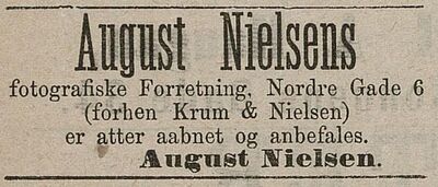 August Nielsen var fotograf i Trondheim en tid sammen med Hans Krum i firmaet Krum & Nielsen. Flere bilder signert Aug. Nielsen i Guneriusbiblioteket. Tre bilder i Minde-Blade fra Sangerfesten i Trondhjem, 1883.