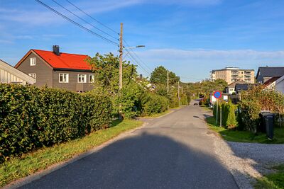 Austliveien sett østover med en av blokkene i St Hansveien i bakgrunnen.