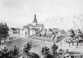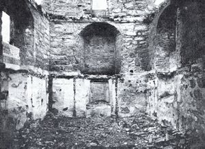 Bilde fra 1857. Austrått har spor frå mange hundreår. Ladegarden på nordsida er forlengst borte, men hovudbygninga, gravkapellet og borggarden med sidebygningar, porttårnet og portalen mot sør står att.