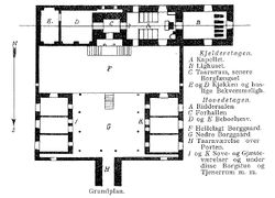 1600-talet vart hovudbygninga supplert med støttemurar, to sidefløyer med bustadsrom og eit porttårn med portal og eit bustadsrom. Ytre sett framstår borgen med dette som tilnærma kvadratisk. Det er en vesentleg nivåforskjell inni borggarden, slik at terrenget i øvre del av borggarden ligg på nivå med svalgangen og andreetasjen i sidefløyene. Grunnfjellet er synleg både i grunnen i nedre borggard og i overgangen. Både øvre og nedre borggard er hellelagt. Troppa mellom nivåa er frå 1600-talet.