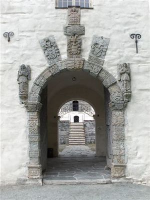 Borgporten med våpenskjolda til eigarane i kleberstein.