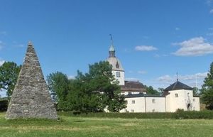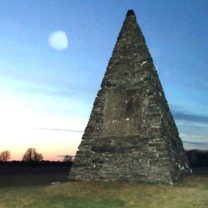 Ein firkanta, mura steinpyramide på sørsida av borga ber ei minnetavle med innskrifta