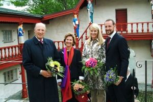 Den norske kongefamilien i borggarden under besøk i juni 2006, på veg til kroningsjubileet i Trondheim