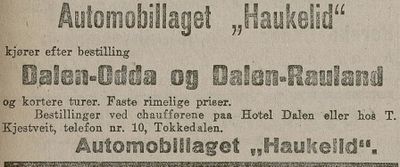 Automobillaget Haukeli blei stifta på Vinje prestegard 6. mai 1911. Laget hadde bilrute frå Dalen (Tokke) til Breifon på Haukeli.