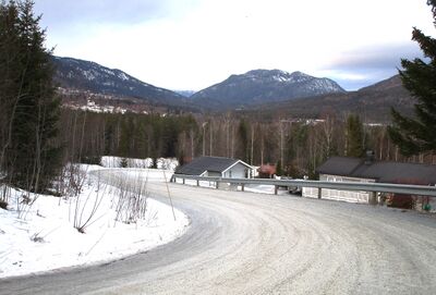 Motiv fra Bakkevegen i Veggli i Rollag kommune. I bakgrunnen skimtes Skagsåsen i Nore og Uvdal kommune.