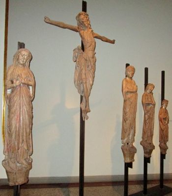 Et krusifiks og flere helgenstatuer fra kirka befinner seg i Oldsaksamlingen.
