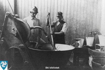 Fra knadehuset ved Grubernes Sprængstoffabriker A/S, ca. 1925. Helge Underland og Jens Jensen er i full gang med produksjonen.
