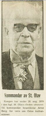 | Det er ikke alltid lett å fremheve en enkeltinnsats. Men Arno Berg var med overalt. Hans arbeidsdag i Norge strakte seg over nesten 60 år, og i mer enn førti år satt han i ledende stillinger og ombud. ... Når han ikke satt i en komite eller ikke var på befaring eller oppmåling, kunne han påtreffes i Statsarkivet, i Riksarkivet eller i en av dagsavisenes redaksjoner. Allikevel hadde han alltid god tid, snakket - ofte lenge - med alle han traff om alt han var opptatt av, og rakk allikevel å forske og skrive. Han likte å slåss, helst for noe, men han foretrakk å overbevise og overtale. ... Arno Berg var åpen, meddelsom, med en uryddig charme. | ||