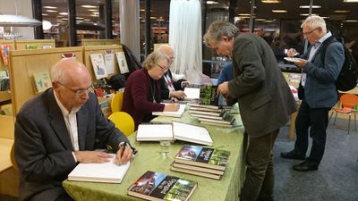 Berit Nøkleby skrev også lokalhistorie og bidro med to kapitler i boka Oppegård blir til som utkom i 2014 i anledning kommunens 100 års-jubileum. Her signerer forfatterne bøker på lanseringsdagen i Oppegård bibliotek i november 2014. Fra venstre forfatterne Finn Erhard Johannessen, Berit Nøkleby, skjult bak henne er Willy Østberg. I midten er Ola Alsvik og den blå armen tilhører siste av de seks forfatterne, Ole K. Endresen. Til høyre står Birger Løvland som venter på et signert eksemplar.