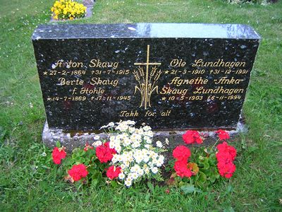 Berte Skaug var født Hohle, men gifta seg med ringsaksokningen Anton Skaug (1864-1915), bokholder ved Totens Bryggeri. De bodde på bruket Stangbakken, like ved Stange skole. Paret fikk to barn, Arne (1900-56) og Agnethe (1903-94), men Berte Skaug fortsatte å jobbe som lærerinne etter at ungene ble født. Også dattera Agnethe ble lærerinne.