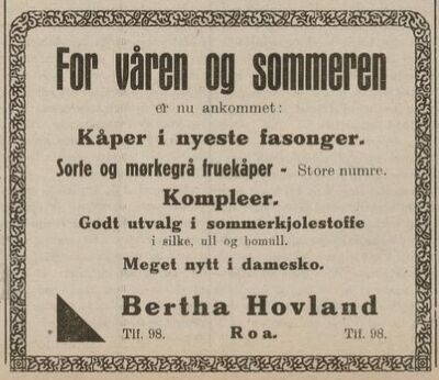Bertha startet egen manufakturforretning på Roa. Først under navnet Bertha Ballangrud, og fra 1935 under navnet Bertha Hovland. Hun annonserte i lokalavisen Hadeland, og annonsene viser at varesortimentet varierte etter årstider og høytider. Oktober 1941 annonserer hun at hun flytter forretningen hjem «til Steffen Hovlands gård». Etter det annonserer hun ikke lenger i lokalavisen og det synes som hun slutter driften av butikken. Firmaet Bertha Hovland ble oppløst i 1950.