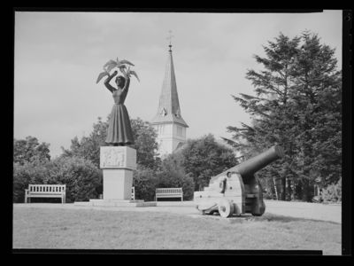 Kirkeheia i Grimstad i 1957. I forgrunnen minnesmerket laget av Ståle Kyllingstad, i bakgrunnen tårnet på Grimstad kirke.