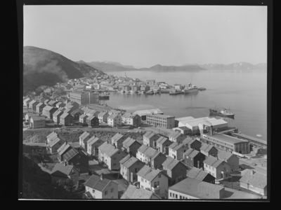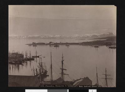 Hammerfest under kong Oscar IIs besøk i 1873. Illustrasjon fra boka Hans Majestæt kong Oscar II.'s Reise i Nordland og Finmarken Aar 1873 av J.A. Friis (1874).