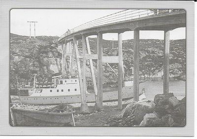 M/S Fosen passerer under Dolmsundbrua i 1959, i forgrunnen en åfjordsbåt.