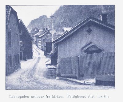 Løkkegata, andre huset til venstre var fattighuset. Fotografi fra boka Holmestrand og omegn av G. Graarud (1907).