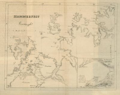 Hammerfest under kong Oscar IIs besøk i 1873. Illustrasjon fra boka Hans Majestæt kong Oscar II.'s Reise i Nordland og Finmarken Aar 1873 av J.A. Friis (1874).