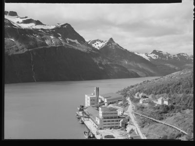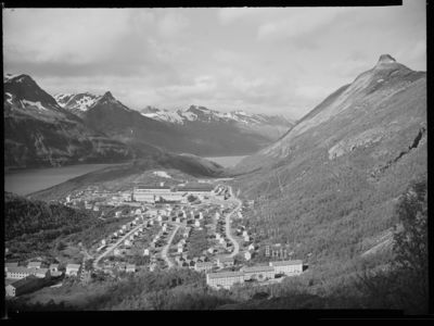 Glomfjord, utsikt over Glomfjorden i 1958. Både tettsted og fjord har sannsynligvis navn av pitesamisk rot - rett øst for tettstedet ligger fjellområdet Glomfjellet/Klubmávárre.