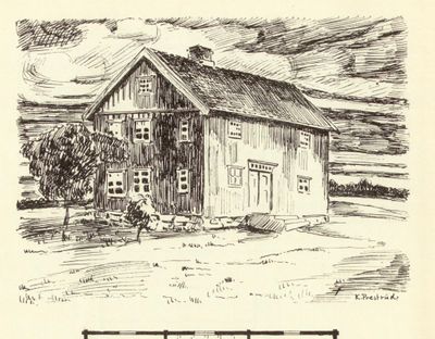 Hovedbygningen på Harestad, tegning av arkitekt K. Prestrud, hentet fra boka Kråkstad. En bygdebok, utgitt 1929.