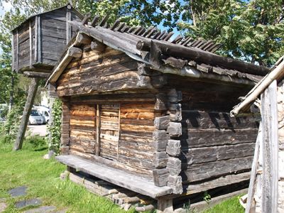 Pitesamiske stabbursbygninger ved Silvermuseet i Arjeplog: Til venstre ein njalla, til høgre ein ájjte.