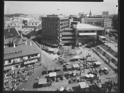 Torget i Stavanger rundt 1960, i midten Magnus Vigrestads statue av Alexander Kielland, som ble avduket i 1928.