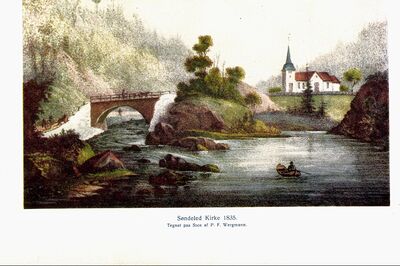 Søndeled kirke i 1835, tegnet av P. F. Wergmann. Hentet fra boka Risør gjennem 200 aar av Tallak Lindstøl (1923).