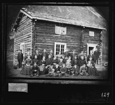 Gruppe personer foran ei stue i Junkerdalen/Juŋŋkárvuobme i andre halvdel av 1800-tallet.