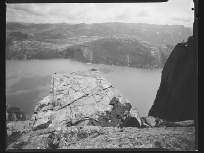Utsikt frå Preikestolen i Strand. Forsand ligg på andre sida av Lysefjorden.
