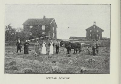 Arbeidsfolk på søndre Onstad, fotografi fra boka Skiptvet herred 1814-1914 av A. Skipperud (1916).