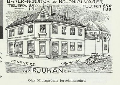 Olav Midtgarden kolonialforretning i Storgata 25. Tegning fra Telemarks-bindet av Det norske næringsliv.