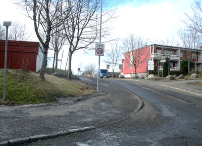 Den delen av Blakkens vei hvor alminnelig ferdsel med bil er tillatt, er ikke lengre enn at den er mulig å gjengi på ett bilde. Vi skimter Lofsrudveien bak trærne i bakgrunnen.