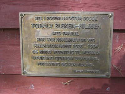 Plakett på Rosenlundstua, der det står at Bleken-Nilssen «bidrog vesentlig til museets utvikling gjennom utbygging, forskning og formidling.»