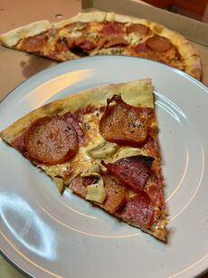 Bobos serverer italiensk pizza, her representert ved en Bobo's Spesial (pepperoni, salami og champignon).
