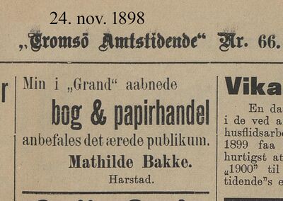 13. mars 1894 kom den første bokhandelen i Harstad. Det var klokker Kornelius N. Sjursen som startet denne med lokaler i Grand Hotel. Da han døde i 1897, overtok sønnen Olav Sjursen klokkerstillingen, men ikke bokhandelen, som ble nedlagt. Året etter, i november 1898 åpnet Mathilde Bakke Bokhandel i Grand, trolig i de samme lokalene. I 1902 kjøpte hun Strandgata 12 og drev bokhandelen videre her fram til 1921, da hun flyttet fra byen og solgte gården og forretning til Petrus Nandrup som drev Nandrups Bokhandel. Da Nandrup forlot byen etter konkurs i 1925, ble gården solgt til Edvin Thorbergsen, som startet bilforretning i gården. I 1925 åpnet Aasta Rasmussen (senere Aasta Kristiansen) Harstad Bokhandel i Strandgata 8.