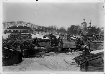 Boris Gleb. I forgrunnen ser vi bl.a. fleire stabbur. Den nyare, totårna kyrkja frå 1874 er attast til høgre i bildet.