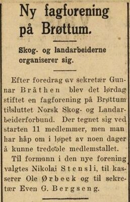 Faksimile fra Hamar Arbeiderblad 5. februar 1935; notis om etableringen av Brøttum skog- og landarbeiderforening, som fant sted tre dager før.