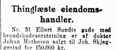 Faksimile fra Aftenposten 5. oktober 1922: Salg av eiendommen Eilert Sundts gate 31.