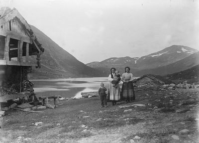 Breive turiststasjon omkr. 1905. F.v. Bjørgulv K. Breive (1900-1989), mora Birgit K. Breive med Olav K. Breive (1903-1986) på armen. Ho lengst til høgre er Anne K. Breive (1879-1957). Foto August Abrahamson. Frå biletsamlinga ved Setesdalsmuseet.