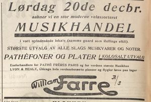 I en stor annonse i Vestlandske tidende annonserer William Farre A/S at de åpnet en moderne velassortert musikkhandel i "samme gaard som Rellings Eftf."[2] Farre startet landets første skolemusikkorps, Møllergata skole, og omtales som "guttemusikkens fader".[3]