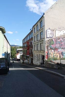 | 9 | 1886 / 1913 | Produksjonslokale | Hovedbygningen oppført for Nordisk Tekstil i 1913 etter at tidligere fabrikkbygning brant, andre deler av anlegget er fra 1886. Ark. Petter Thane. Tidligere hadde Halvor Schou drevet bomullsveveri herm, før han grunnla Hjula Væverier. En kontorbygning ut mot veien ble renovert i 1982, og i 1997 starta ombygging til konsertsted. I 1998 åpna Blå i disse lokalene. Strykejernet kunst- og malerskole holder også til i bygningen. | |
