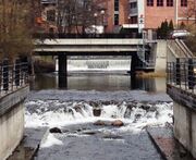 Vøyenbrua Akerselva Gården Vøyen Griffenfeldts gate / Marcus Thranes gate Sagene 1949/1950 Gammelt vadested. Brua erstatta en eldre gangbru like ved. Vøyenbrua Oslo 2014.jpg