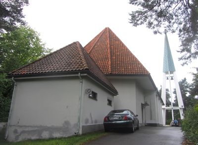 Mens den nye kirken ble bygget fungerte villaen Fredriksborg i nærliggende Fredriksborgveien 18 som interimskirke. Den er nå menighetshus.